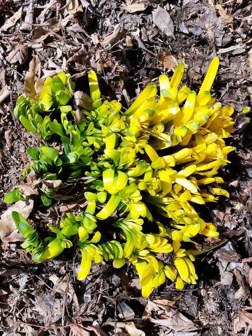 Surprise lilies were under a thick cover of leaves, but they just pushed the leaves up. They’ll green up once they get some sun.