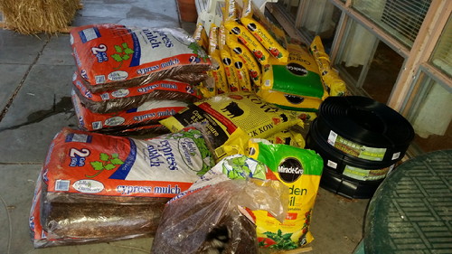 My patio looks like a garden centre, and this isn’t even all of it! I’ve already used two rolls of edging, four or five bags of soil, two or three of compost, and there are two more bags of mulch on the other side. My trunk is wet, but I have mulch!