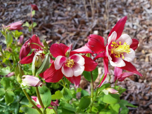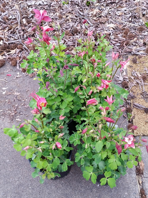 I went to Buchheit this morning to get 20 more bags of mulch, completely forgetting it was easter Sunday, and they were closed. I was very disappointed, but the greedy bastards at Walmart weren’t closed, so I consoled myself with four bottles of Deer-B-Gon (clearance, 50% off), and six lovely columbine plants, which were $3.33 each (regular price!) I didn’t get them planted today, but they’re in 8″ pots, so they’ll be okay until I’m not too dead to dig.