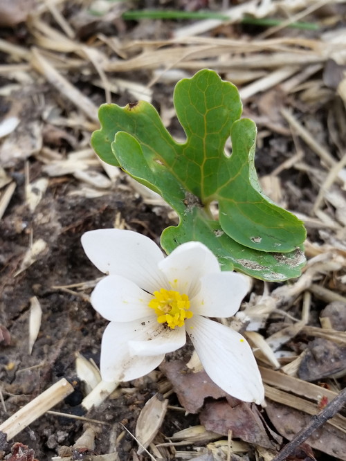I took a little tour of the garden, and found…a bloodroot bloom! There are more plants, but only one bloom for now. I’ll take it!