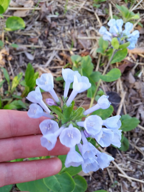 I also planted a few seeds here and there (too tired, didn’t keep track), and put 28 crocosmia bulbs (20 Lucifer and 8 Montbretia) in the Honeysuckle Horseshoe. Still have plenty of seeds yet to plant, a few blazing star bulbs, and the six columbine that will be done blooming by the time I get them in the goddamned ground. However, I also have…bluebells! They’re growing well and quite lovely.