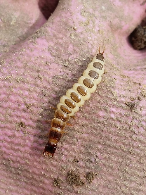 I found roughly a brazillion worms, but also a few of these guys. Carabidae larva, I believe. Very speedy for a larva!
