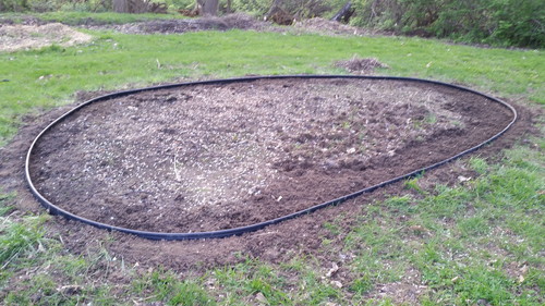I took the afternoon off today and decided to put the edging on my cosmos bed. I’d enlarged and reshaped it a bit one day when it was the only soil not still frozen, but hadn’t finished removing the grass because I wanted rain to rinse off as much soil as possible; the soil down there isn’t half bad, considering the neglect. I had hoped to finish it, get it planted and throw on what mulch I’ve made so far, but…crabgrass. Fuck crabgrass; it all just needs to die. Anyway, I did at least get the edging done, so there’s not a whole lot left before I can plant. Whole lot of rain for the next week, though, so I dunno. Roughly 15′ long, 8′ wide, roughly an ellipse, so about 94 square feet.