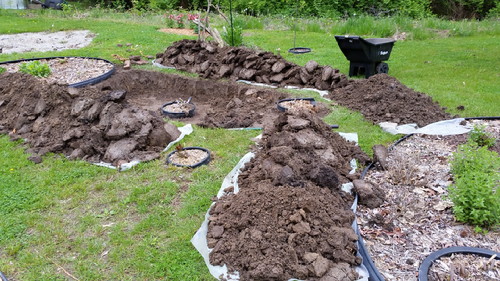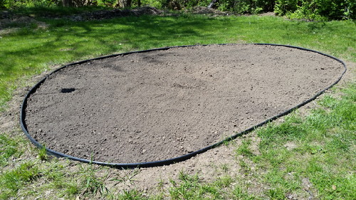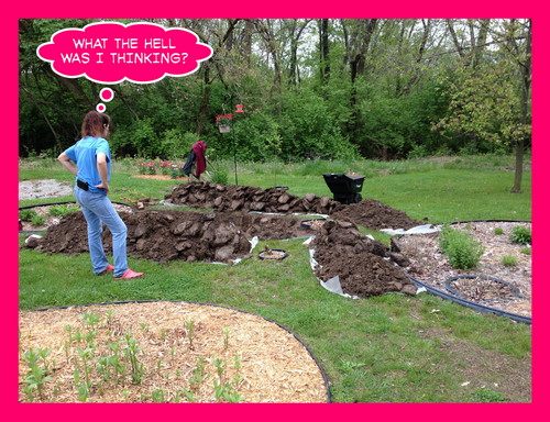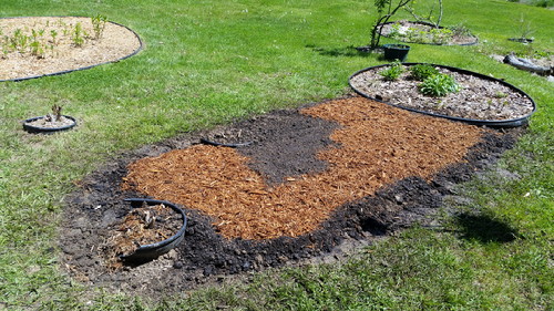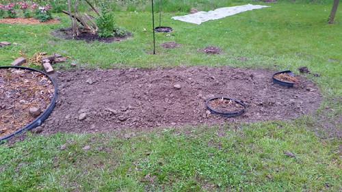 It was waaaaay too much work to just call it a flowerbed. It was an undertaking! On Friday afternoon, I took half a day vacation and stripped off the grass. The crabgrass, quack grass, and clover, all rooted at the core of the earth. No pictures; I was too tired. On Saturday, it was supposed to rain/thunder/crap, but I took a chance anyway and started digging.