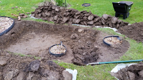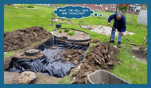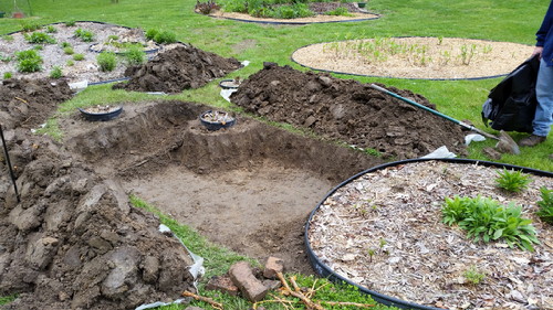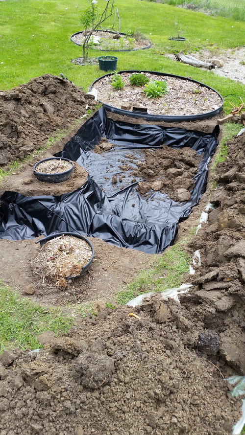 I was a little short on the pond liner because the cable (whatever it’s for) that runs through my milkweed bed also runs through this one, so I had to leave that shallower and go up and over, and back down. No big deal.