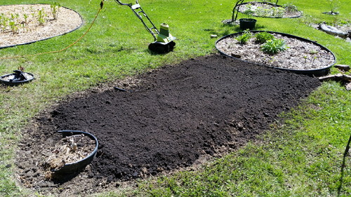 This morning, P fixed my tiller, so I put four bags of compost and two big bags of MG soil in. Sounds like overkill, but the soil is not good there, and after that much work, I want my stuff to grow!