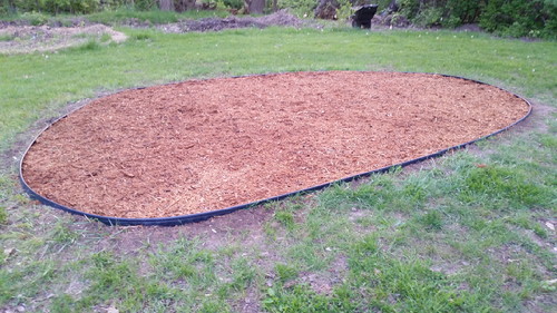 Another one under my 2015 belt! I started right after I got home; seeded the bed, shredded what was shreddable from the pile beside the bed, spread it over the seeds, took the unshreddables to compost, trimmed the grass I couldn’t mow last Thursday because there was a pile beside the bed, spread a light covering of cypress mulch (still took almost 4 bags), and soaked with water.