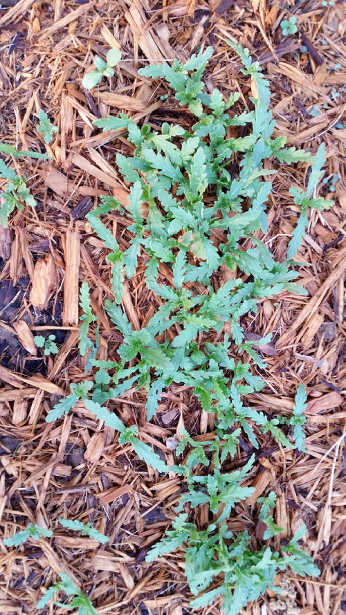 I have no idea what these are, but they’re growing nicely in the concrete flowerbed on the south side. EDIT: They’re Garland Daisy, Chrysanthemum coronarium.