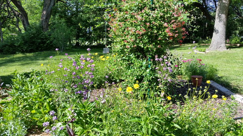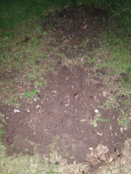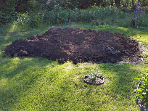 They levelled it, but kind of didn’t notice the little Nanho Blue butterfly bush. They ran over it with the skid steer, and then buried it. Took me a few minutes to find its remains; there’s nothing left above ground, but maybe it’ll recover. The roots should be okay, and it’s still early enough in the season that it may grow. I might actually move it, since they mashed the poor thing anyway. They also knocked over my poor, put-upon forsythias, but I just straightened those.