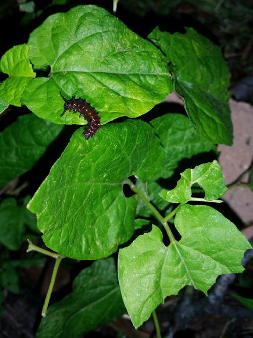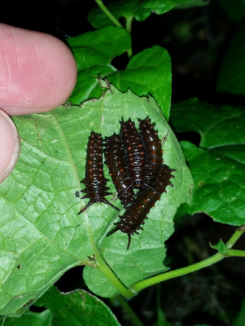 It was nearly dark, and I did take some macros earlier with my camera, but here are my pipevine ‘pillars. The eggs were gone in a few days, so I assumed they’d been eaten, but apparently, Pipevine Swallowtail hatches in just that little time. The little dudes hang out and eat together when they’re small, then they feed separately, and finally, wander off to pupate.