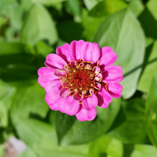 First zinnia of 2015 won by a petal’s width; there’s also a red one just about open.