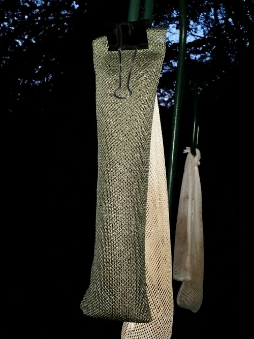 I made a prototype finch feeder while I was watching L&O: SVU. The top isn’t finished because I don’t have paracord yet, and I want to be sure of the size before investing too much effort, so it’s just stuck up there with a big binder clip. Hopefully it won’t fall, and hopefully, they’ll use it.