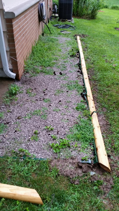 It was getting dark by the time I’d finished binding up my poor skilsaw to cut 45s on two of the landscape timbers that were really too thick to cut with it, but I wanted to at least get them started. I don’t think I’ll be able to finish today because they’re wet, but I will tomorrow, assuming it doesn’t rain again before then.