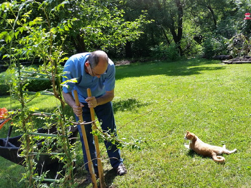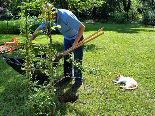 Then, I got started on the post holes for the trumpet creeper. The first one wasn’t bad, except that I got rained on, then the second one, I ran into water and two biiiig roots, and the sun came out, so I was sweating Third one, I ran into more water, and my arms were getting tired. P helped with the fourth one, but it wasn’t fair because he had an assistant, and I didn’t!