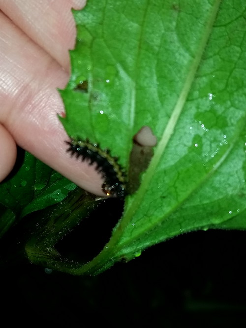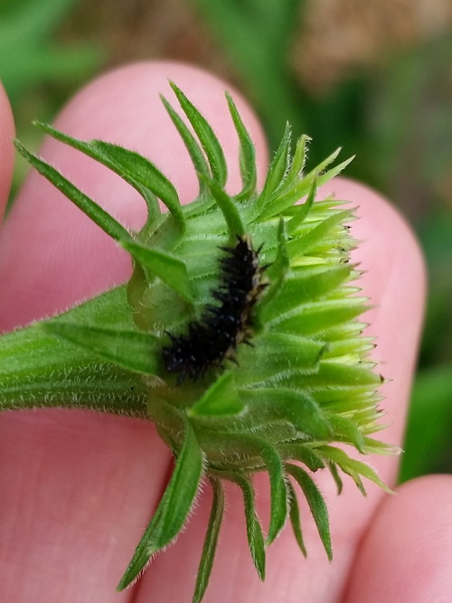 I found a bunch of these caterpillars on Tuesday evening; they’re on coneflower, and I think they’re Silvery Checkerspot.