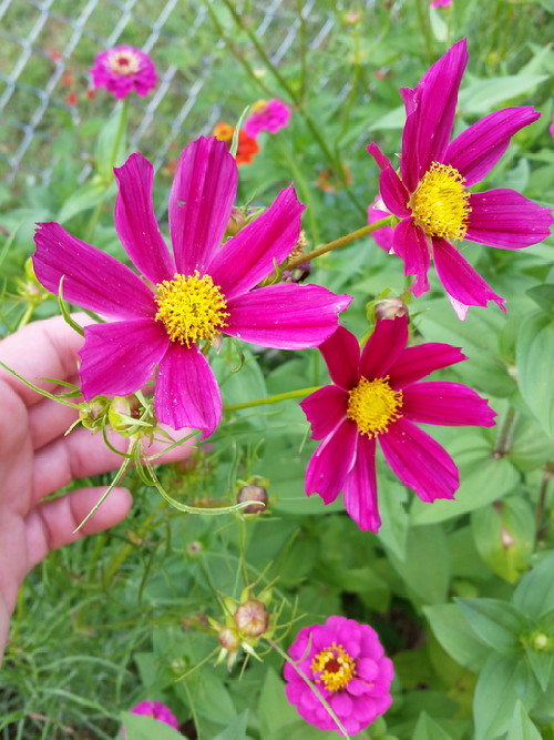 These are along the fence, but I don’t remember planting them; I thought the only cosmos put there were dwarf orange/yellow/gold. This is not orange/yellow/gold.