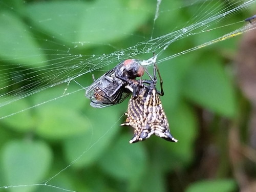 Spined micrathena with a fly. I love these spiders with their weird, spiky butts.
