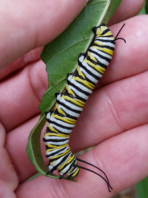 My Spicebush Swallowtail caterpillars are still alive, and I had six Monarchs in various stages, but lost one to a predatory stink bug. I normally leave those guys alone, but that one I caught with my poor caterpillar impaled, so it’s now an ex-predatory stink bug. This is my biggest Monarch; he’s not far from being a J, so I hope nothing gets to him–I want a butterfly!