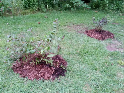 I had to change MLB feeders, too, so it was almost dark by the time I’d finished, but we got enough rain last night that I was able to plant the last two, long-suffering Wine and Roses weigela that I got ages ago but had kept on the patio. They don’t look like much now, and the soil is pretty barren over there, but I dug big holes and used lots of Black Kow, so hopefully they forgive me and grow.