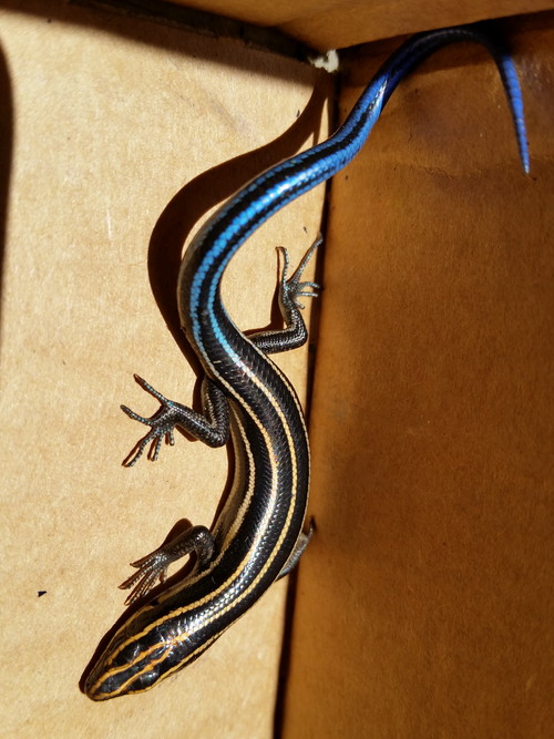 B saw this baby five-lined skink running across the shop floor this afternoon, and C helped me catch him. Work isn’t a good place for a very small lizard, so I brought him home in a box and released him by the creek. Very cute, very fast.