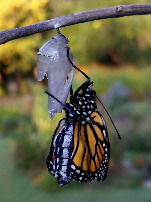 It’s a good thing I stopped to check the first Monarch chrysalis of 2015 before I left for work! I noticed that the chrysalis had turned colour, so I thought I’d better take it to work; that way I’d at least know the poor thing wasn’t ready to fly and eat, but trapped inside. I dusted off the container (it was in the garage, and I didn’t bother to dust it when I first put the chrysalis in there), and readied it to head off to work. I was already running late, and that made me a little more so. I finished getting ready for work, gathered up my stuff, went out the door and stopped to lock it…at which time, I looked down, and there was a brand new butterfly! Obviously, I couldn’t take it to work, so I had to stop and get her (I think) out of there, walk through the wet grass in my work sandals and long skirt, and carefully place her in a butterfly bush so she’d have something close by when she was ready to eat. I told B and C that I was sure that would’ve been an excuse for lateness that even they had never heard before!