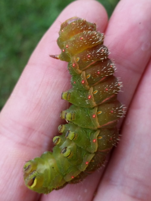 I was moving stuff off the back patio in preparation for power washing the siding, windows and the concrete because I’d got some power washer detergent at lunchtime  (yellow for concrete, red for siding, and blue for automotive). In behind the concrete “Welcome” thing that I intend to repaint with our name someday, I found a friend. I’d found his poop last weekend, but couldn’t find him. He’s quite pink, so I’d say he came down, looking for a nice place to pupate, but all he found was a concrete patio. I made him a little bed of dry leaves in a plastic container. I hope he makes it; I can’t remember the last time I saw a Luna that wasn’t battered and faded, but this one will be brand new!
