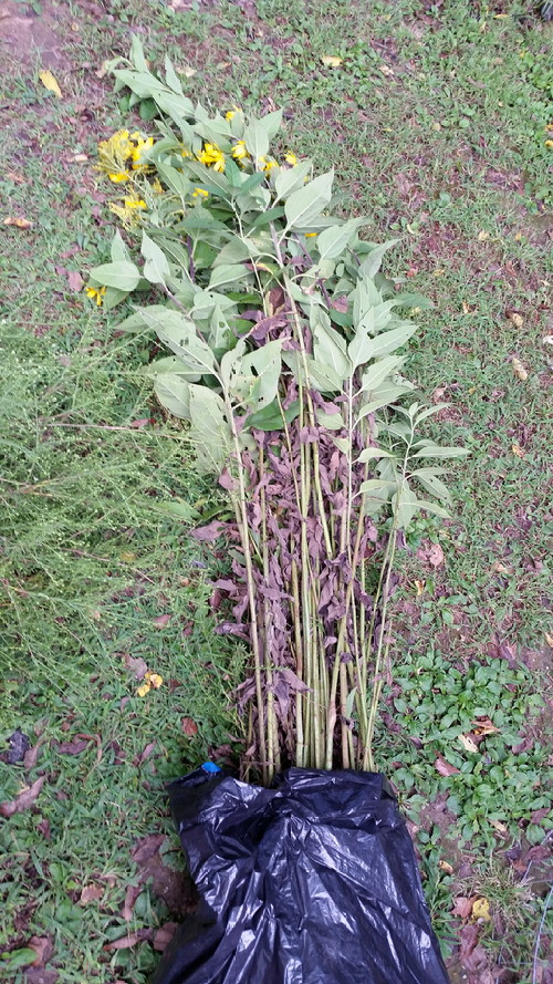 Yesterday, on my way back from the bank at lunch, I noticed a stand of tall yellow flowers growing in an unused lot on the corner. I turned around, stopped and walked over to look because I thought they might be cup plant. Anyway, I mentioned them to B when I got back to the office, and he didn’t know who owned the lot, but suggested MyGIS. It was on there, indeed, owned by some kind of holding company or something. I was going to try to find someone to ask about taking some of the plants, but B said that if they’re just weeds anyway (and they are), no one would care or probably even notice if I went early on a Saturday morning…so that’s exactly what I did! I left a little before 8:00AM, and B was mostly right; almost no one noticed. One guy who lives across the street did come over to see what I was doing because he was thinking maybe someone had pot plants there or something, but I told him it was a “roadside weed project”, and that the plants I was collecting were Symphyotrichum, Solidago, and Silphium (the Silphium was a lie because they weren’t cup plant after all and I didn’t know what they actually were), and we chatted for a few minutes, and he left. I packed up the yellow flowers, some goldenrod, and some frost aster in HK, and headed for home. My life of crime; purloined roadside weeds. 🙂