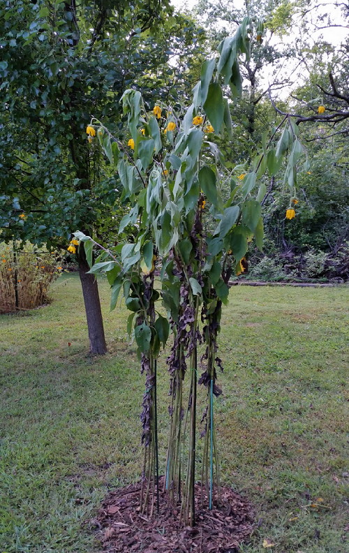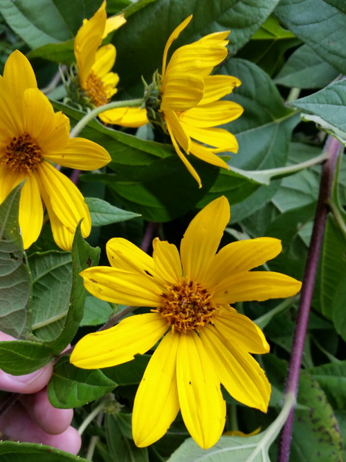 Pre-wilted. Since I wasn’t sure what they were, I took some photos and sent them off to the experts at FlowerChecker. In a matter of hours, I had an ID…Jerusalem artichoke. They look like sunflowers because they are, but they’re not Helianthis annuus, they’re Helianthus tuberosus, and a perennial. The tubers are apparently edible, but I have no intention of eating them; I want them because butterflies and bees like them, and finches and other little songbirds like to eat the seeds.