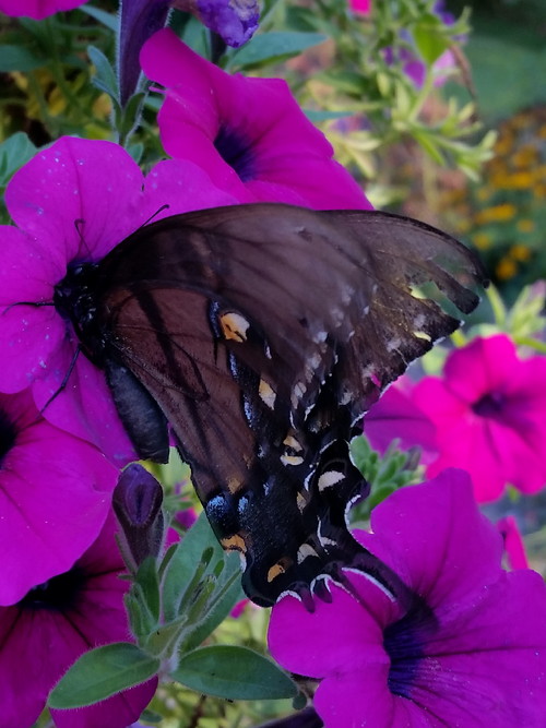 Pretty, black form female Eastern Tiger Swallowtail. She was shy at first, but eventually, I caught her face-first in the ‘toonyas.