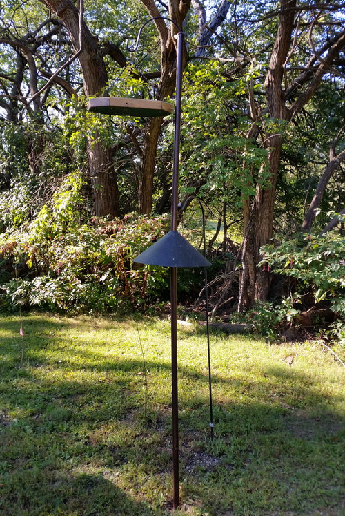 I actually did this yesterday, but forgot paint for the bit that’s (deep, thanks to me, a sledgehammer, and a scrap of 2×4) in the ground, plus is was dark when I’d finished, but Onje’s days of picking off mourning doves right out of the feeder are over. Assuming, of course, that he doesn’t own rocket boots, because now, that feeder–the bottom part–is approximately 8′ off the ground. B gave me 7.5′ of brown vinyl-coated top rail that had been bent a bit and couldn’t be used for fencing, and said I could have a cap, and a scrap of swedge-end galvanized top rail. I cut the fork off the bottom of a shepherd’s hook that was too short to be useful, then drilled a hole in the cap the diameter of the hook. I drove the scrap of top rail into the ground, swedge end up, so that about 10-11″ protruded. I fitted the hook through the cap, put the long bit of the hook inside the pole, then put on the cap. I’ll seal it with silicone when I have time, so water doesn’t get inside the pole, but for now, it’s functional. I couldn’t straighten the pole because I’m not heavy enough (HA!), but it’s not noticeable unless you’re looking for it, so it can wait…possibly forever. In the meantime, my stupid chickens are safe; that’s their favourite feeder. It’s a PITA to refill, but I’ll create steps like I did with the other tall feeder. Maybe D will sell the rest of the osage-orange if those people don’t come and get it soon. We’ll see.