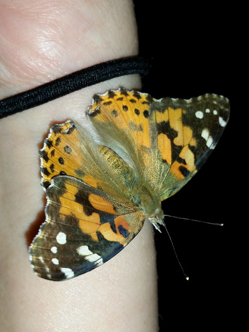 I went outside to lock the garage, and thought a large moth flew by my head. Nope…a Painted Lady butterfly…in full darkness, almost 2100h. He/she got stuck in the web of an enterprising spider that’s set up shop right under the outside light, so I got the butterfly out before the spider could get it. I took her (or him: I can’t sex Vanessa cardui) inside, and into a dark room to calm down, then into a container in the dark for the night. I don’t know what a butterfly was doing out at night, but I’ll release it in the morning. Sorry, Miss Spider; I love you and know you have to eat, but it’s cheating to catch confused butterflies at night! 🙂