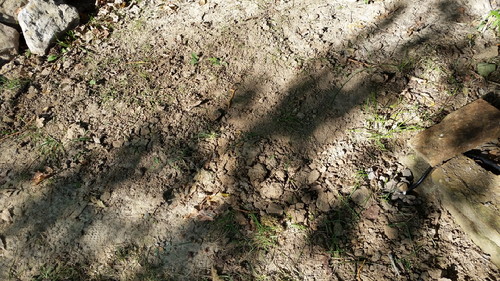 Here is a photo of dirt. Also a photo of 4′ of PVC pipe I got yesterday at lunch, buried just barely under the surface, and the section of pond pump cord that I won’t trip over or have to step over again is inside it. The waterproof connector cover will be here tomorrow, but the extension cord doesn’t go underground; it’ll be hidden across the back of the flowerbed.