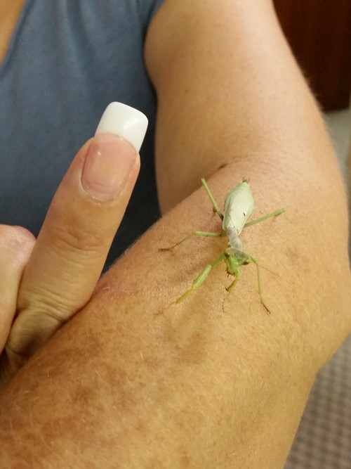 A few from Friday first. B called the office from the back of the shop to tell me that, “There’s a praying mantis out here if you want it,” and of course, I did. I named her Roberta, and C manti-sat while I cleaned the bathroom.