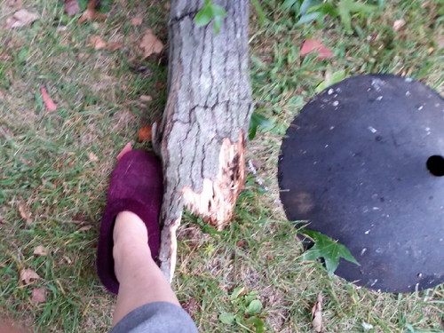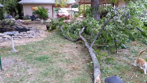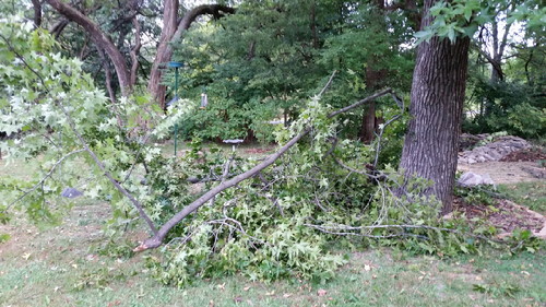 Technically Friday, but I didn’t hear it because I was in the house, having supper, but P said he heard a slow, “craaaaack”, and feared for our roof. The roof was fine, but there was a goddamned big branch on the ground, and a slightly smaller one that it took down with it.