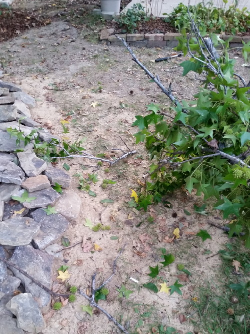 I got the branches cut up, put the big pieces over behind the pond (perches for birds and dragonflies), got out my chipper and shredded a bunch, and anything that wouldn’t chip or had too many spiky balls went to the brush pile. I raked up the small stuff, ran dry bush honeysuckle that I’d cut last week through the chipper to clean the blades after shredding leaves/green spiky balls, and you’d almost never know the branches had fallen. The only casualty was the terra cotta feeder, which I’ll order from Amazon.