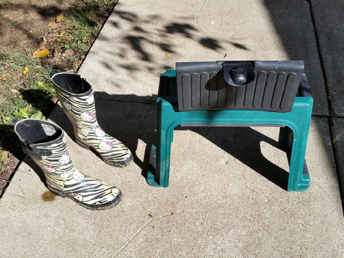Got the clay off my Hello Kitty boots that I’d worn digging the pond, and also washed my weeding stool.