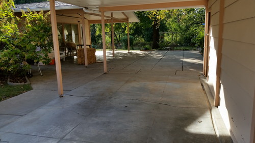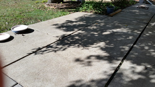 Since I had the pressure washer out anyway, I decided to finish as much of the patio as I could without having to move OK’s hoce or the decorative straw bales that have graced the patio since February because they’re now a cat bed I’m not allowed to move.