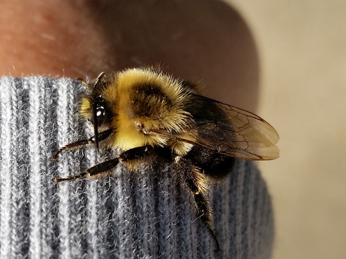 I found a cold bumblebee on the door, so I put him on my hand and took him over into the sun. He did a few leg lifts, vibrated his wings, climbed up on my sweatshirt cuff, and then flew away.