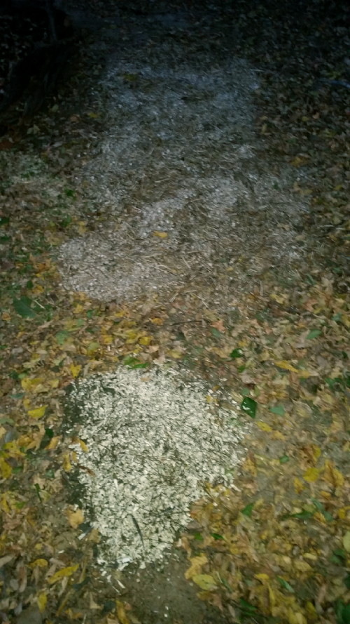 I skimmed and scooped leaves out of the pond earlier today, and also fired up my leaf blower and blew leaves off the patio over to the east end of the pond after i got up from my nap. It was getting fairly late, but I decided what the hell and got out my chipper. I remembered the green-ash this time, and also shredded a crap ton of the Mexican sunflower that I took out when I planted the hollyhocks. I spread the shredded stuff on the ground around the pond. There are probably a thousand seeds in there, but the area doesn’t get sun, and the soil is too poor for even weeds to grow, so I don’t think I’ll have volunteers.