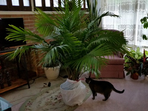 I had put Palmzilla in the gradge, but couldn’t repot it because I used my potting soil. It had to come in, though, so I wrapped the pot with a trash bag, and brought it indoors. It takes up a lot more space now!