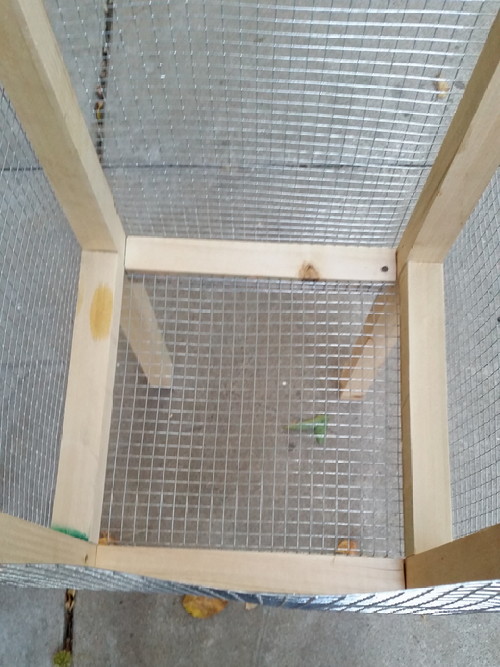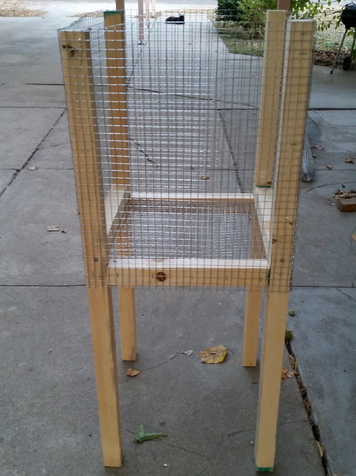 I had two 8′, so I cut four pieces at 36″, then cut the leftovers in half to make crosspieces. 1/2″ hardware cloth on the sides, and on the bottom so water will drain out if any should enter.