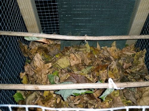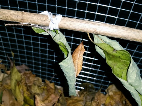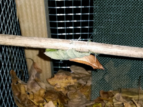 I put some leaves in the bottom with Luna-to-be. I know he’s alive because his cocoon was moving while he waited for me to put leaves in. Disconcerting to see a moving pile of dead leaves, but Lunas are known for being active cocoons. I wired some of the heavy-duty nylon mesh to the wall to make sure he knew how to get up when he ecloses so his wings can expand (or hers…certainly can’t tell yet).
