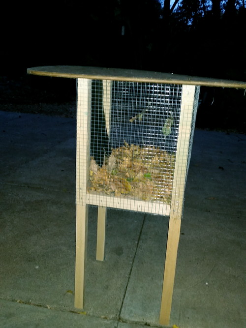I used plywood that had been the bottom of a storage tub kitteh hoce for the roof. Beautiful, no, but they’ll be safe once I put the legs down into the ground enough that it won’t tip. I ran out of daylight, but I’ll make a door by clipping a square/rectangle out and wiring a piece over it. No rush…they won’t be ready to leave until late April or early May. Anyway…the Diapausitron!