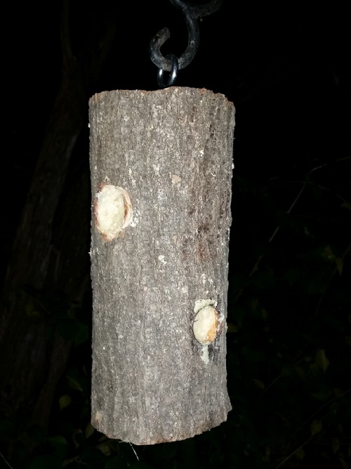 I went out at lunch and got a 1-1/4″ spade bit to drill holes in the chunk of crabapple I cut on Sunday. The bit was almost long enough to go all the way through, and since I had the guide hole because the point did go through, I fudged it with a hole saw and a chisel. Worked fine. I couldn’t find the hooks like the one P used to hang the other plug feeder, so I just moved a shepherd’s hook and stuck it on there. P got heavy duty screw eyes, so there’s no danger of it being broken off or falling out unless a trailer hitch and lots of horsepower is involved. Again, it was dark, but…