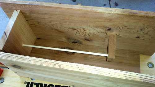 I made the wren hoce today; I had plenty of scrap left from the vertical bird hoces. Since I decided to make the side open instead of the front, I needed to support the long perch.