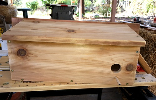 It took some ripping, and a few re-cuts because the angle was different,  but I finished it. I decided that since this one goes on the gradge, I’d install a perch. If I notice any bully birds trying to use it, I’ll cut it off and sand it down. In the meantime, the wrens may appreciate it.