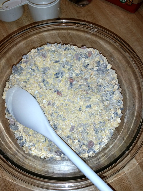 Dry ingredients. Large flake oatmeal, cornmeal, organic whole wheat flour, and fancy no-waste bird seed.