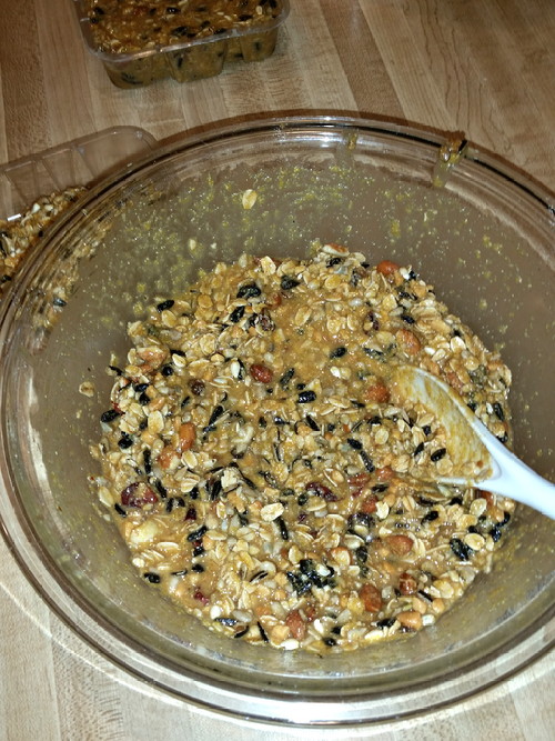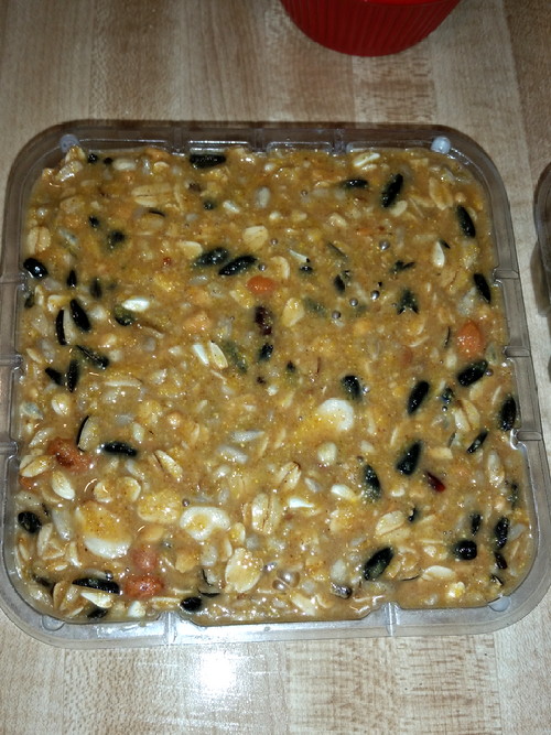 After I got up from my nap, I made goor-met suet cakes. I mostly followed the recipe this time, but once I see how well they’re received, I may make adjustments.
