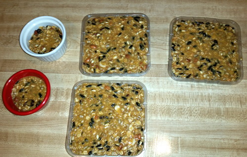 Recipe said four cakes, but they would’ve been cheap-ass cakes, so I did three and put the rest into little condiment cups; I’ll sneak them into regular feeders so the cardinals get suet. Hopefully, starlings won’t notice.