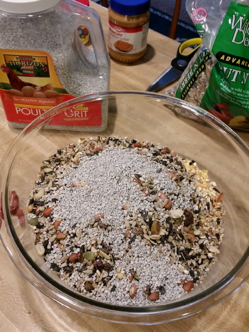 Made more suet; this time with some cracked corn, and poultry grit. The poultry grit is calcium-enriched, which they will definitely need in a couple of weeks so the ladies will make strong egg shells once breeding season comes. That’s not terribly far away, either!